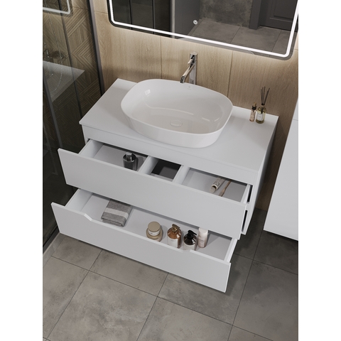 Тумба подвесная с накладной раковиной Orange Line отличается современным дизайном. Изготовлена из МДФ высокой плотности. Мебель покрыта пленкой ПВХ с технологией Soft Touch — ламинация класса премиум, с повышенными тактильными свойствами. Пленка обеспечивает дополнительную защиту мебели от влаги и перепадов температуры. На ящики установлены комплекты скрытых направляющих Hettich, обеспечивающие полное выдвижение и имеющие встроенную систему плавного и бесшумного закрывания. Исполнение - матовое. Материал раковины - фарфор. Отверстия в столешнице под раковину и смеситель монтируются самостоятельно.