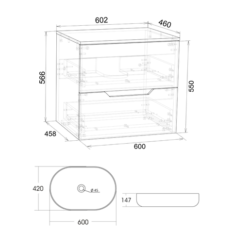 Тумба подвесная с накладной раковиной Orange Line отличается современным дизайном. Изготовлена из МДФ высокой плотности. Мебель покрыта пленкой ПВХ с технологией Soft Touch — ламинация класса премиум, с повышенными тактильными свойствами. Пленка обеспечивает дополнительную защиту мебели от влаги и перепадов температуры. На ящики установлены комплекты скрытых направляющих Hettich, обеспечивающие полное выдвижение и имеющие встроенную систему плавного и бесшумного закрывания. Исполнение - матовое. Материал раковины - фарфор. Отверстия в столешнице под раковину и смеситель монтируются самостоятельно.
