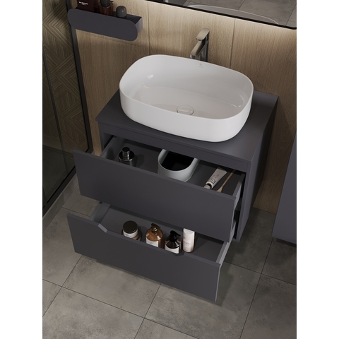Тумба подвесная с накладной раковиной Orange Line отличается современным дизайном. Изготовлена из МДФ высокой плотности. Мебель покрыта пленкой ПВХ с технологией Soft Touch — ламинация класса премиум, с повышенными тактильными свойствами. Пленка обеспечивает дополнительную защиту мебели от влаги и перепадов температуры. На ящики установлены комплекты скрытых направляющих, обеспечивающие полное выдвижение и имеющие встроенную систему плавного и бесшумного закрывания. Исполнение - матовое. Материал раковины - фарфор. Отверстия в столешнице под раковину и смеситель монтируются самостоятельно. Донный клапан приобретается отдельно.