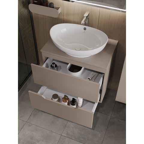 Тумба подвесная с накладной раковиной Orange Line отличается современным дизайном. Изготовлена из МДФ высокой плотности. Мебель покрыта пленкой ПВХ с технологией Soft Touch — ламинация класса премиум, с повышенными тактильными свойствами. Пленка обеспечивает дополнительную защиту мебели от влаги и перепадов температуры. На ящики установлены комплекты скрытых направляющих, обеспечивающие полное выдвижение и имеющие встроенную систему плавного и бесшумного закрывания. Исполнение - матовое. Материал раковины - фарфор. Отверстия в столешнице под раковину и смеситель монтируются самостоятельно. Донный клапан приобретается отдельно.