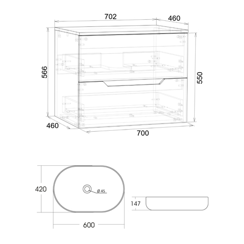 Orange Line Li-70TugMDF+B08-600W тумба с раковиной подвесная 70 см, графит/белый