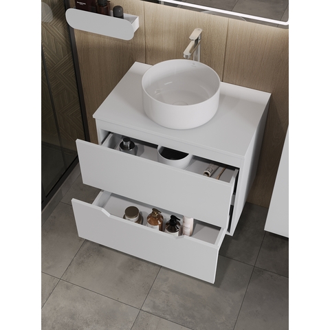 Тумба подвесная с накладной раковиной Orange Line отличается современным дизайном. Изготовлена из МДФ высокой плотности. Мебель покрыта пленкой ПВХ с технологией Soft Touch — ламинация класса премиум, с повышенными тактильными свойствами. Пленка обеспечивает дополнительную защиту мебели от влаги и перепадов температуры. На ящики установлены комплекты скрытых направляющих Hettich, обеспечивающие полное выдвижение и имеющие встроенную систему плавного и бесшумного закрывания. Исполнение - матовое. Материал раковины - фарфор. Отверстия в столешнице под раковину и смеситель монтируются самостоятельно. Донный клапан приобретается отдельно.
