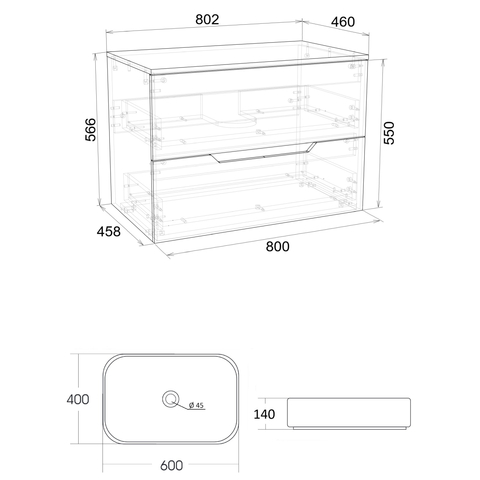 Тумба подвесная с накладной раковиной Orange Line отличается современным дизайном. Изготовлена из МДФ высокой плотности. Мебель покрыта пленкой ПВХ с технологией Soft Touch — ламинация класса премиум, с повышенными тактильными свойствами. Пленка обеспечивает дополнительную защиту мебели от влаги и перепадов температуры. На ящики установлены комплекты скрытых направляющих Hettich, обеспечивающие полное выдвижение и имеющие встроенную систему плавного и бесшумного закрывания. Исполнение - матовое. Материал раковины - фарфор. Отверстия в столешнице под раковину и смеситель монтируются самостоятельно.