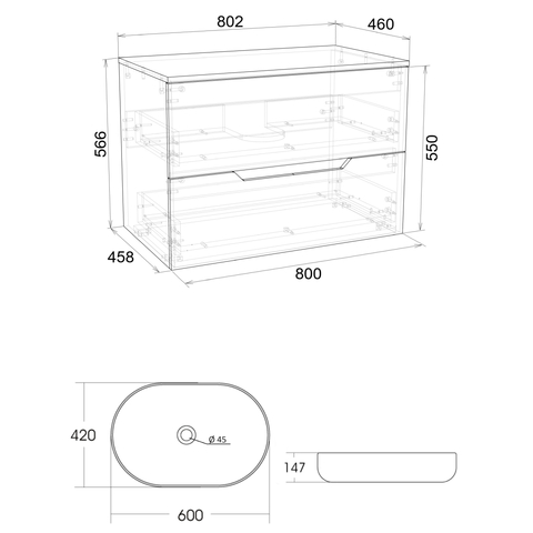 Тумба подвесная с накладной раковиной Orange Line отличается современным дизайном. Изготовлена из МДФ высокой плотности. Мебель покрыта пленкой ПВХ с технологией Soft Touch — ламинация класса премиум, с повышенными тактильными свойствами. Пленка обеспечивает дополнительную защиту мебели от влаги и перепадов температуры. На ящики установлены комплекты скрытых направляющих Hettich, обеспечивающие полное выдвижение и имеющие встроенную систему плавного и бесшумного закрывания. Исполнение - матовое. Материал раковины - фарфор. Отверстия в столешнице под раковину и смеситель монтируются самостоятельно.