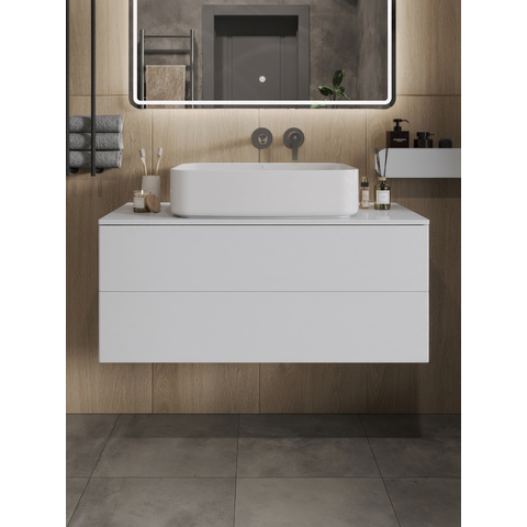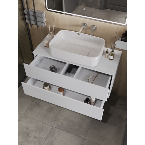Подвесная тумба Orange Otto с раковиной-чашей и столешницей МДФ, с двумя выдвижными ящиками. Предназначена для использования в ванных комнатах с повышенной влажностью. Система Push to Open: ящики открываются нажатием на них. Высокое качество сборки, материалов и фурнитуры. Столешница, корпус и фасад: МДФ, плёнка ПВХ белая глянцевая. Раковина накладная - фарфор. Отверстия в столешнице под раковину и смеситель монтируются самостоятельно. Донный клапан приобретается отдельно.