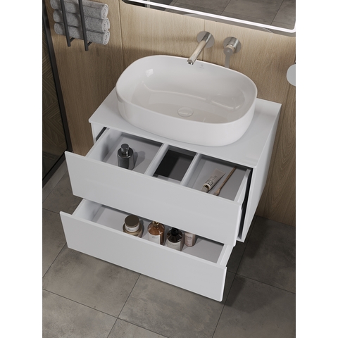 Подвесная тумба Orange Otto с раковиной-чашей и столешницей МДФ, с двумя выдвижными ящиками. Предназначена для использования в ванных комнатах с повышенной влажностью. Система Push to Open: ящики открываются нажатием на них. Высокое качество сборки, материалов и фурнитуры. Столешница, корпус и фасад: МДФ, плёнка ПВХ белая глянцевая. Раковина накладная - фарфор. Отверстия в столешнице под раковину и смеситель монтируются самостоятельно. Донный клапан приобретается отдельно.