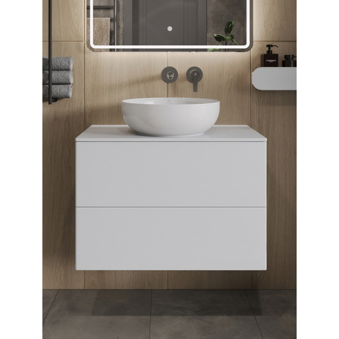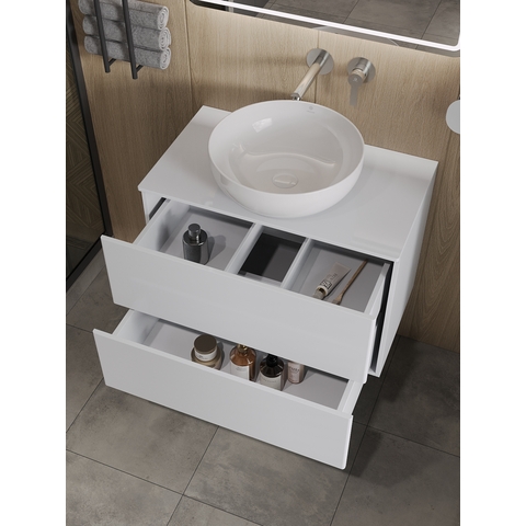 Подвесная тумба Orange Otto с раковиной-чашей и столешницей МДФ, с двумя выдвижными ящиками. Предназначена для использования в ванных комнатах с повышенной влажностью. Система Push to Open: ящики открываются нажатием на них. Высокое качество сборки, материалов и фурнитуры. Столешница, корпус и фасад: МДФ, плёнка ПВХ белая глянцевая. Раковина накладная - фарфор. Отверстия в столешнице под раковину и смеситель монтируются самостоятельно. Донный клапан приобретается отдельно.